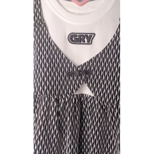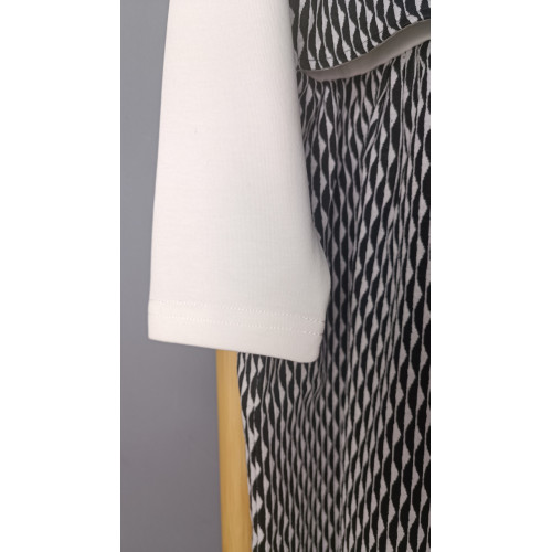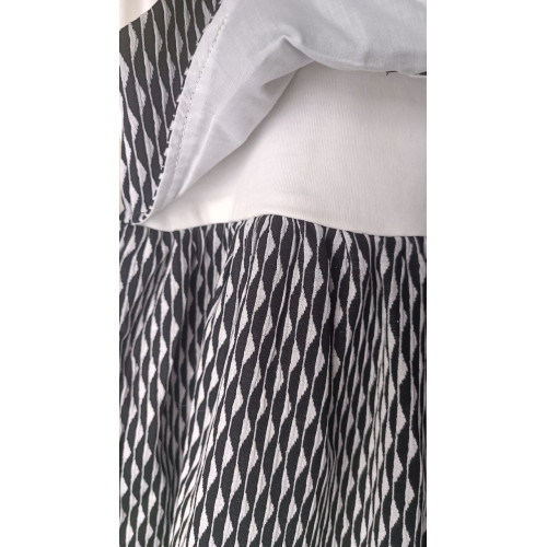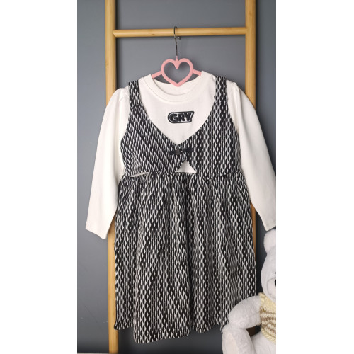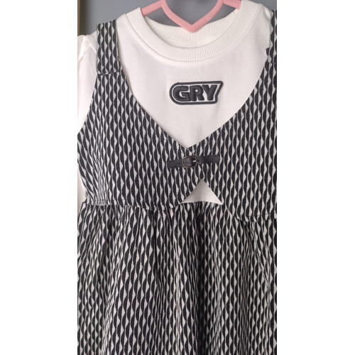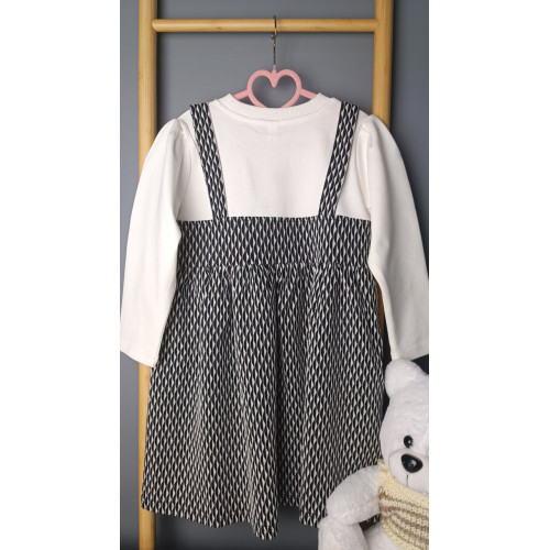 Белый лонгслив с длинными рукавами в сочетании с черно-белым сарафаном, имеющим уникальный геометрический принт. Имитация жилета. Это платье отлично подходит как для повседневной носки, так и для особых случаев.