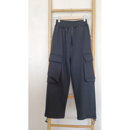 Брюки: брюки карго черного цвета с боковыми накладными карманами, придающие практичность и современный вид. Свободный фасон обеспечивает комфорт и свободу движений. Снизу имеют кулиску.