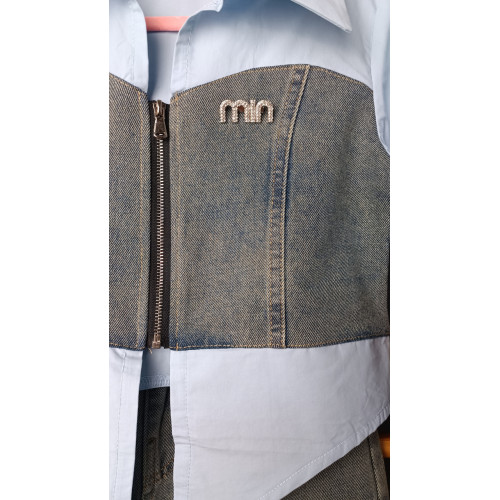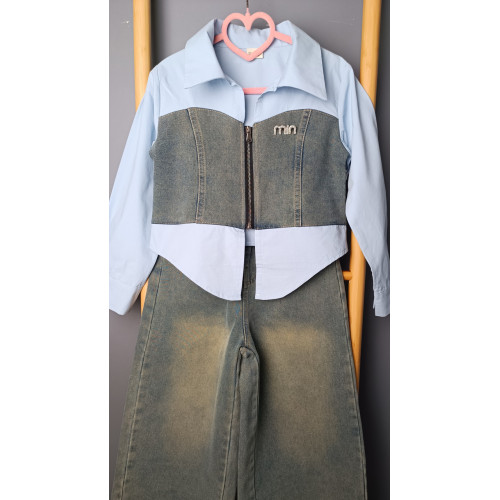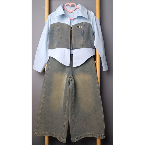 Джинсовый костюм с рубашкой и корсетным топом (имитация) и джинсовыми брюками палаццо для девочки.