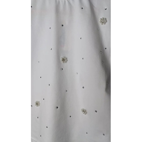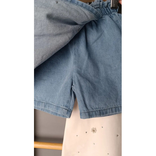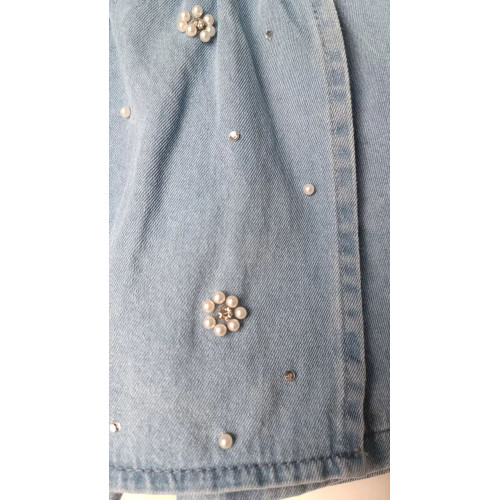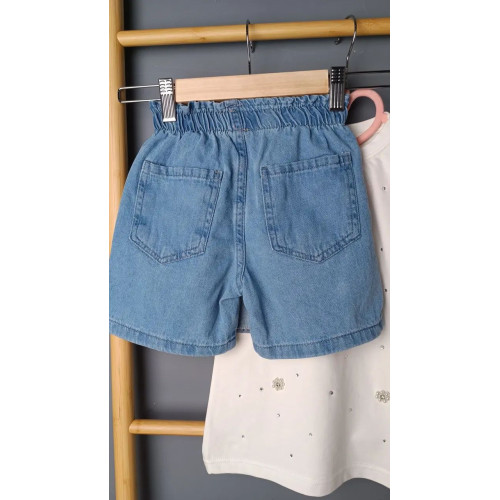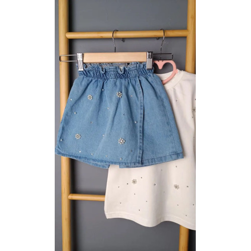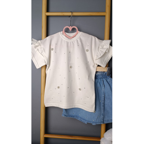Стильный look для девочек. Белая футболочка с жемчужным декором и джинсовая юбочка-шорты с цветочным блеском. Идеальный вариант для лета.