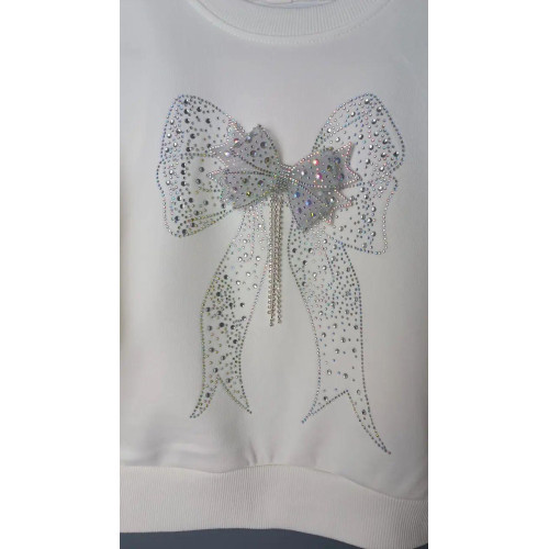 Дизайн: Свитшот украшен большим блестящим бантом из стразов на груди, что придает ему праздничный и нарядный вид.