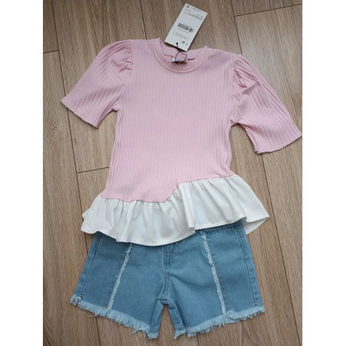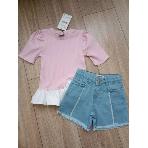 Костюм для девочки Jeliboom футболка в рубчик и джинсовые шорты, рост 140 см