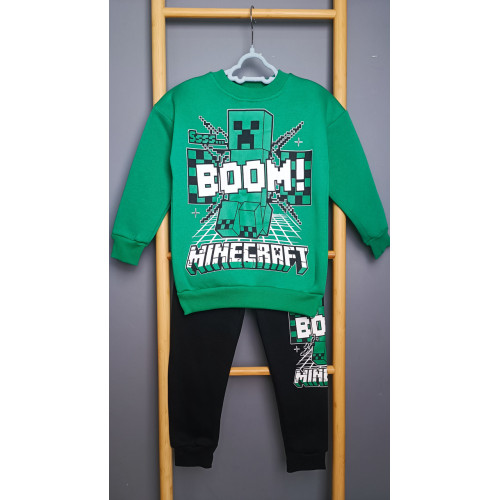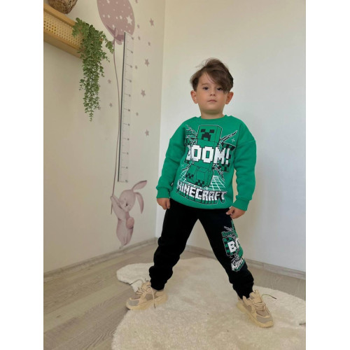 Дизайн: Свитшот зеленого цвета с большим принтом персонажа Крипера по игре Minecraft и надписью "BOOM! MINECRAFT". Брюки черного цвета с принтом, повторяющим элементы дизайна свитшота.