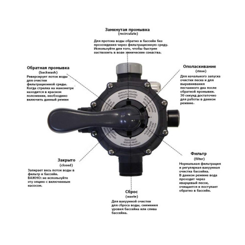 Для перехода с картриджного фильтра потребуется приобрести адаптеры Intex 10722 или Bestway 58236 (D32 мм на D38 мм). Для отвода грязной воды после промывки рекомендуется шланг Intex 10720.