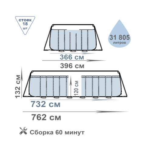 Прямоугольный каркасный бассейн Intex 26368 Ultra Frame Rectangular Pool — это премиальная модель для всей семьи. Его большие размеры позволяют одновременно купаться нескольким людям, а прямоугольная форма делает его особенно удобным для плавания и активного отдыха.