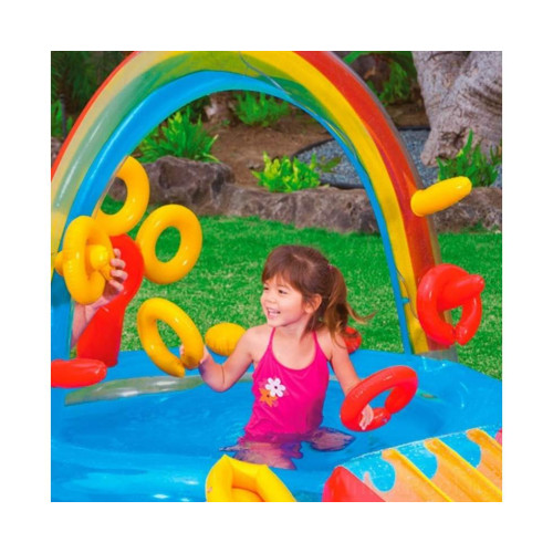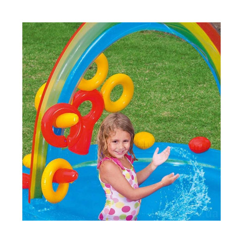 Intex 57453 "Радуга" — это красочный детский игровой центр с горкой и двумя бассейнами, который станет любимым местом летнего отдыха вашего ребёнка. Он оснащён аркой в виде радуги с разбрызгивателем, водной горкой и множеством игровых аксессуаров.