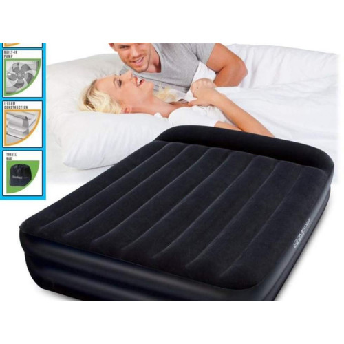Поверхность покрыта мягким флоком, который приятен на ощупь и удерживает постельное бельё на месте. Высота 46 см обеспечивает удобную посадку. Встроенный электронасос позволяет надувать и сдувать кровать за 3–4 минуты. Конструкция I-Beam обеспечивает стабильность и отличную поддержку тела.
